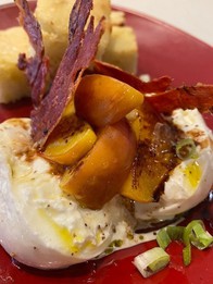Burrata Plate$15.00house made burrata, seasonal local fruit, crispy prosciutto, balsamic reduction, olive oil, focaccia. gluten free focaccia availableGluten Free Focaccia -