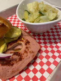 German Style Meatloaf$12.50also known as LEBERKÄS WECKLE spicy Mustard, onions, pickles on sourdough bun with side of Potato Salad/Kartoffel Salat, - Beef Tri Tip Sando$17.00This is one loaded beef sandwich!! Roasted Tri Tip, caramelized onions, melted Swiss cheese on toasted Sourdough Deli, mayonnaise.Side of Fries orSide of German Potato Salad