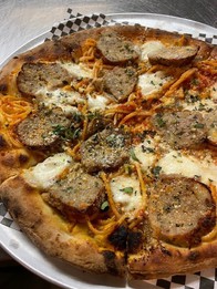 Pizze Spaghetti + Meatball$23.00red sauce, garlic butter, creamy mozzarella, parmesan, oregano.Available GF Crust - Manchester$23.00red sauce, pepperoni, Italian sausage, prosciutto, mozzarella, caramelized onions,Available GF Crust